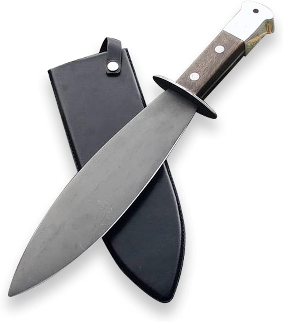 Features high carbon steel, full tang, blued matte finished blade that’s razor-sharp on one cutting side and 1/3 of the reverse edge.