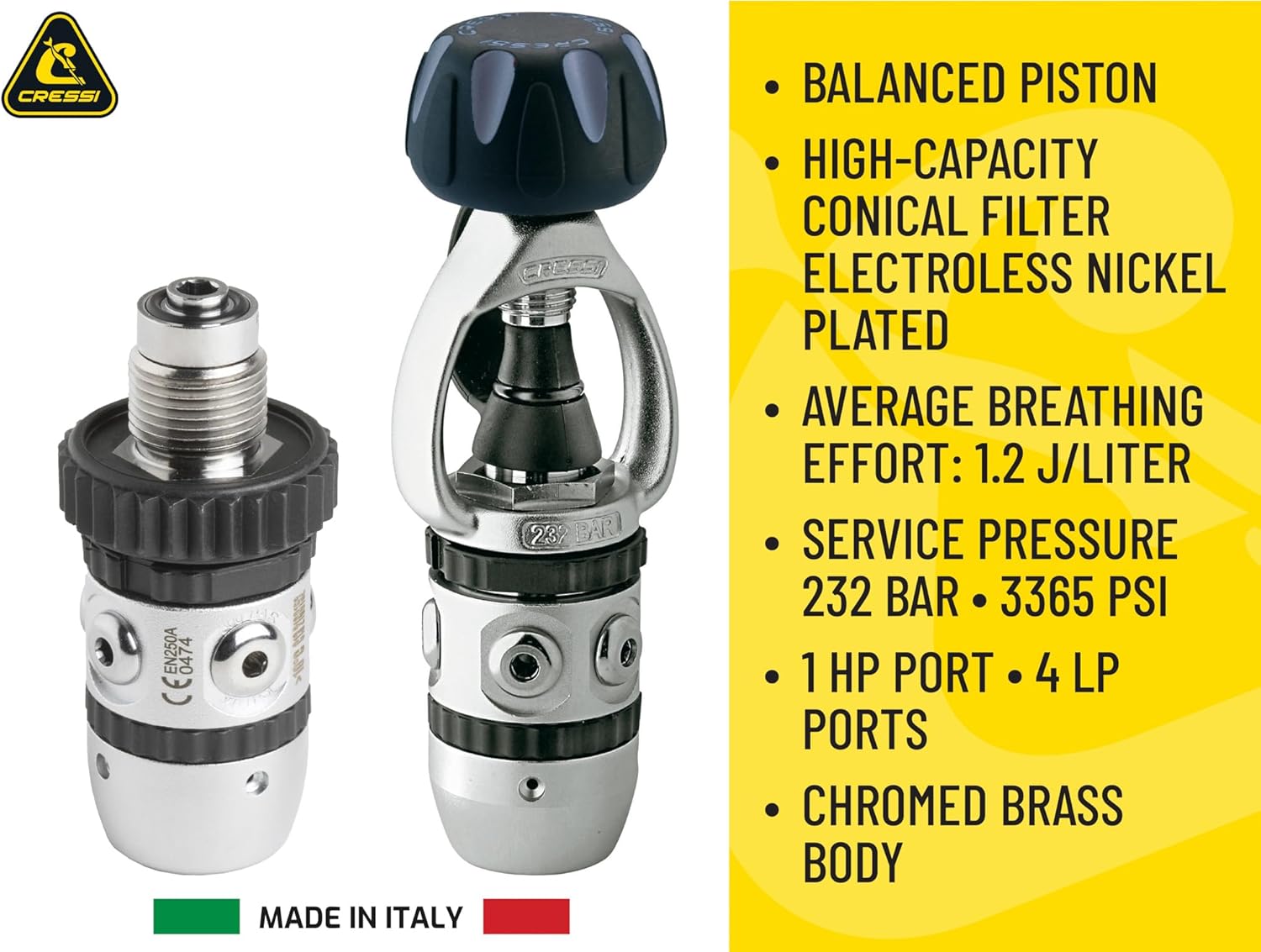 This regulator is made up of the new 2nd stage XS Compact with elastomer cover combined comes with the traditional Cressi AC2 piston 1st stage.