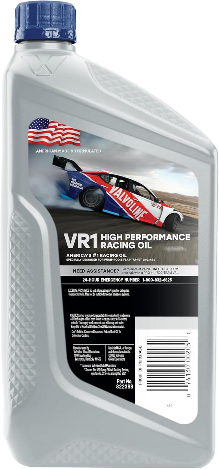 From drag strips to paved and dirt ovals, racing performance demands race-level protection. Which is why motorsport teams and enthusiasts depend on Valvoline VR1 10W-30 Racing Motor Oil, America’s #1 racing oil. Our exclusive high zinc and phosphorus formula is engineered specifically for modern and classic high-performance engines both on and off the track, which includes flat-tappet and performance cam motors. It’s chemically designed to reduce internal friction and enhance power output, while protecting critical engine parts from wear under the extreme conditions of racing. While its high load carrying characteristics, minimum foaming under stress and maximum resistance to thermal degradation ensure stability and lubrication. Valvoline VR1 10W-30 Racing Motor Oil is recommended for high-performance gasoline engines as well as those burning full or partial alcohol fuels. It is not recommended for vehicles with catalytic converters or in wet clutches. Go with the proven winner, Valvoline. The trusted motor oil brand for over 150 years.