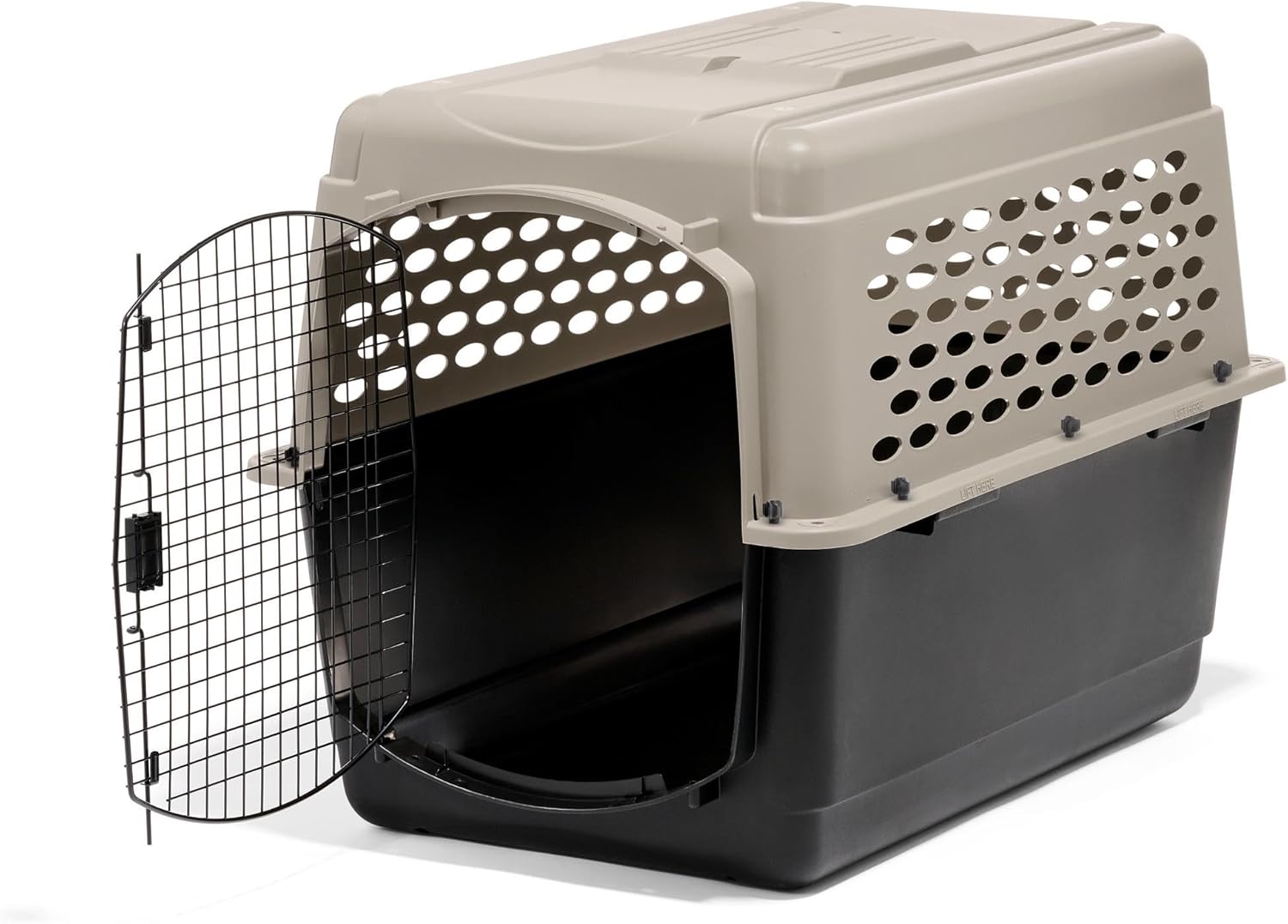 The Petmate Vari Dog Kennel is great choice for those seeking secure and versatile dog crates for large dogs. This large dog crate serves as both a sturdy travel companion for car rides and an airline-friendly carrier. Crafted from sturdy plastic with a durable wire door, this large dog carrier offers peace of mind with its easy-open latch and tamper-proof holes for added security, great for air travel and a key feature of any travel dog crate. This petmate dog crate offers ventilation on all 4 sides, so your furry friend remains cool and comfortable. Its dimensions make it great for dogs weighing 50-70 lbs, offering them enough space to move and rest comfortably. No tools are needed to assemble this dog kennel, making it a convenient dog carrier for medium dogs who are on the go. It's also easy to clean, with a sturdy shell and a stay-dry moat that pulls fluid away from your pet in case of accidents, a feature that is particularly useful for those in the process of housebreaking puppies. Proudly made in the USA, this airline-friendly pet carrier is made with 90% to 100% pre-consumer recycled materials.
