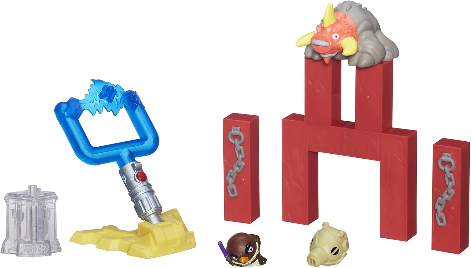 La aplicación Angry Birds Star Wars cobra vida. Esta línea de juguetes de Hasbro captura toda la diversión de lanzar y destruir la aplicación en formato físico y presenta a tus personajes favoritos de Star Wars reimaginados como Angry Birds voladores y cerdos villanos. Apila los bloques de este set y coloca encima tu figura de Jango Fett Pig en su vehículo Slave I. Luego coloca tu figura de Obi-Wan Kenobi Bird en el lanzador y dispara. ¿Puedes destruir la pila y derribar al cazarrecompensas? Descúbrelo con el set Bounty Hunters. Hasbro produce los productos de Star Wars bajo licencia de Lucas film Ltd. Hasbro y todos los términos relacionados son marcas comerciales de Hasbro.