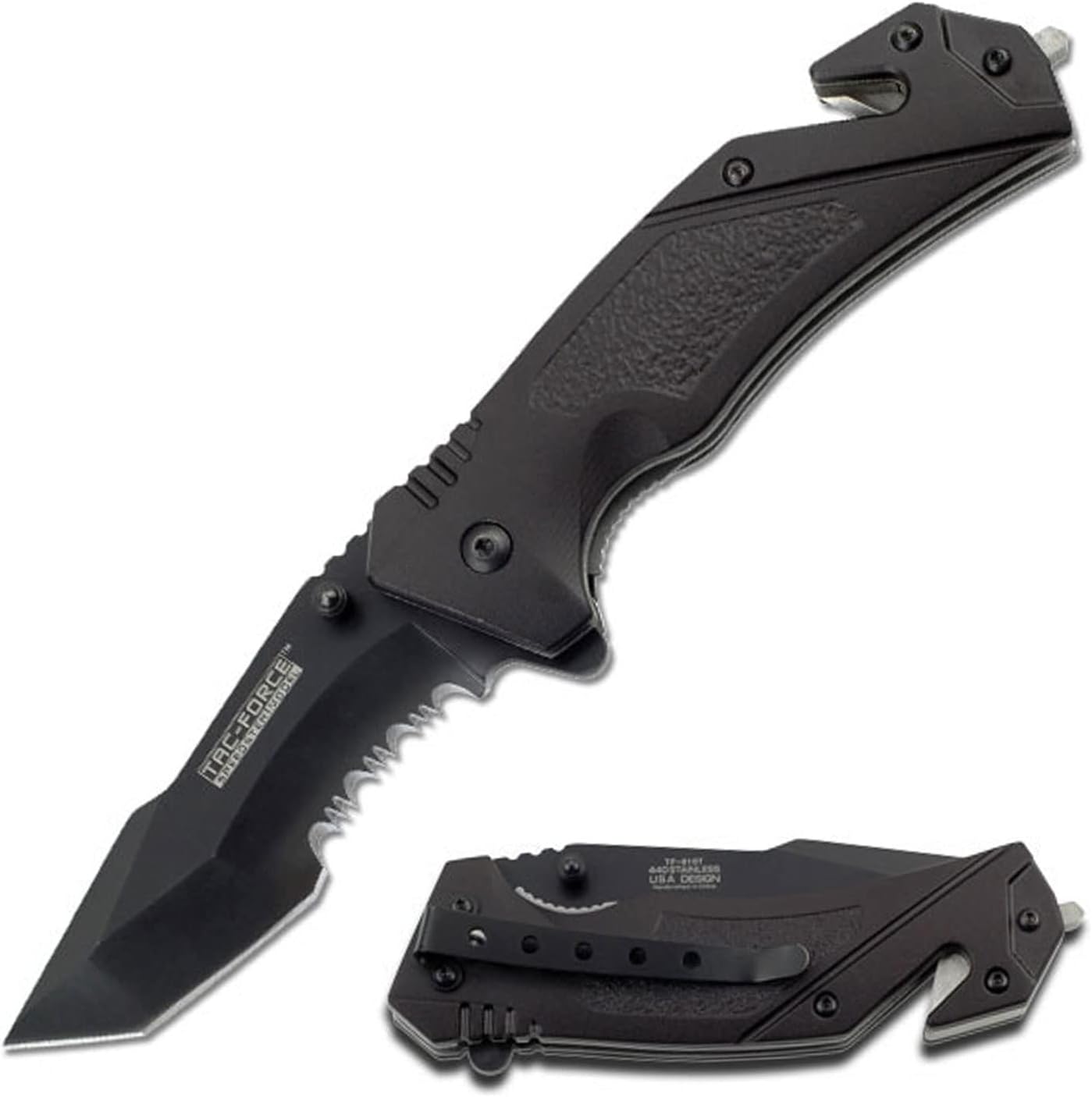 Tac-Force Folding Pocket Knife – Black Partially Serrated Stainless Steel Tanto Blade, Black Aluminum Handle with Rope Cutter, Glass Punch, Tactical, EDC, Rescue - TF-810T
