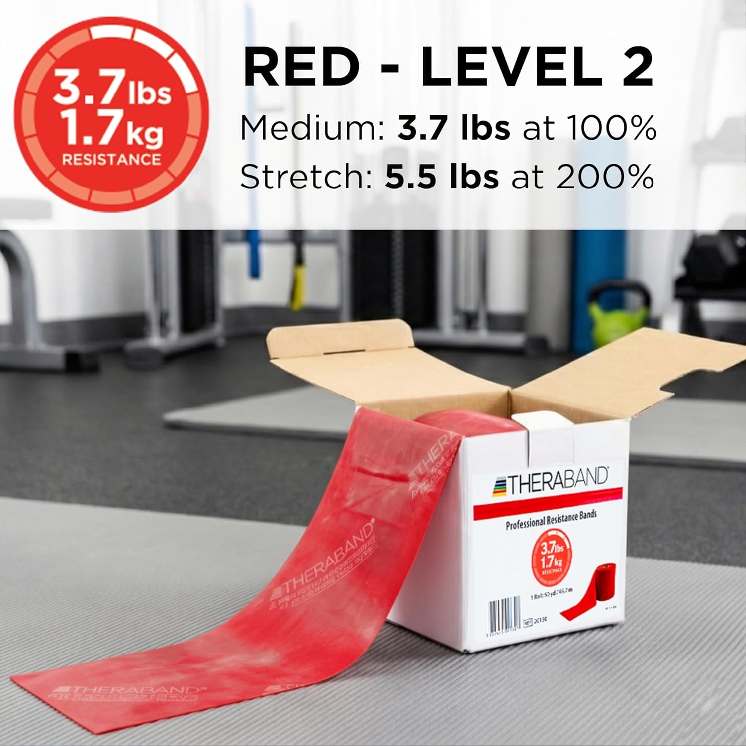 Medium Red Bands are the third of eight levels of resistance and great for rehabilitation and light resistance exercise, they offer 3.7 lbs. resistance and 25% increase from preceding color at 100% elongation, and 5.5 lbs. at 200%, each roll measures 50 yards long x 4" wide