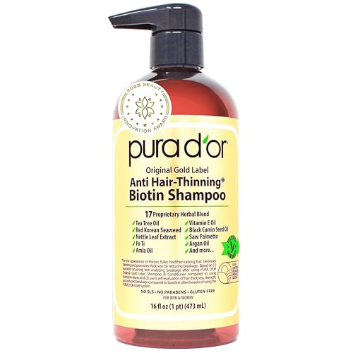 PURA D'OR 16 Oz Champú Original de Oro Anti-Adelgazamiento Biotina con Etiqueta de Oro, Aroma Natural Terroso, CLINICAMENTE PRUEBAS EFECTIVOS Resultados, Productos Herbales para Engrosar el Cabello, 3-1 Lavado, Mujeres y Hombres, Cabello Tratado de Color