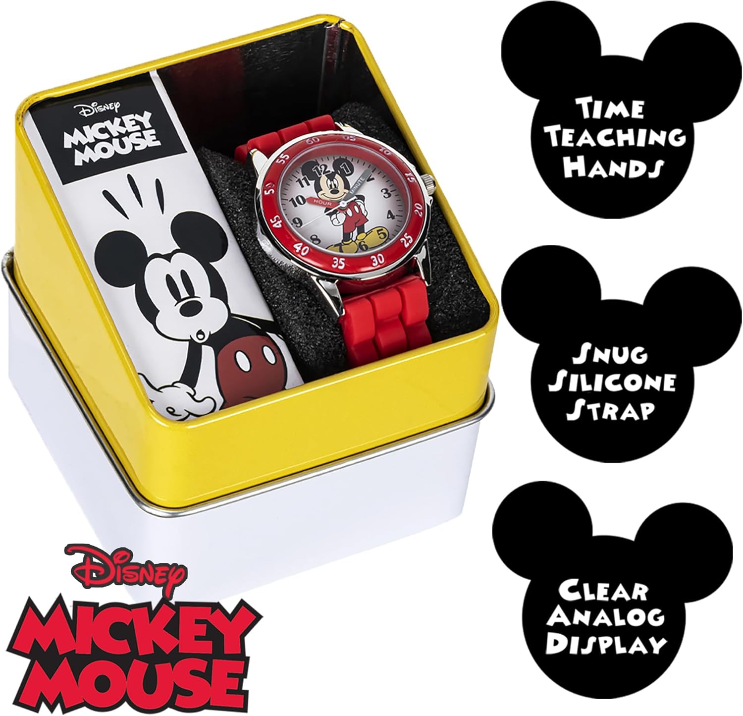 Mickey Mouse Kids Analog Time Teacher Watch, Easy-Read Dial, Fun Educational Watch, Silicone Strap, Red, White, and Grey Options