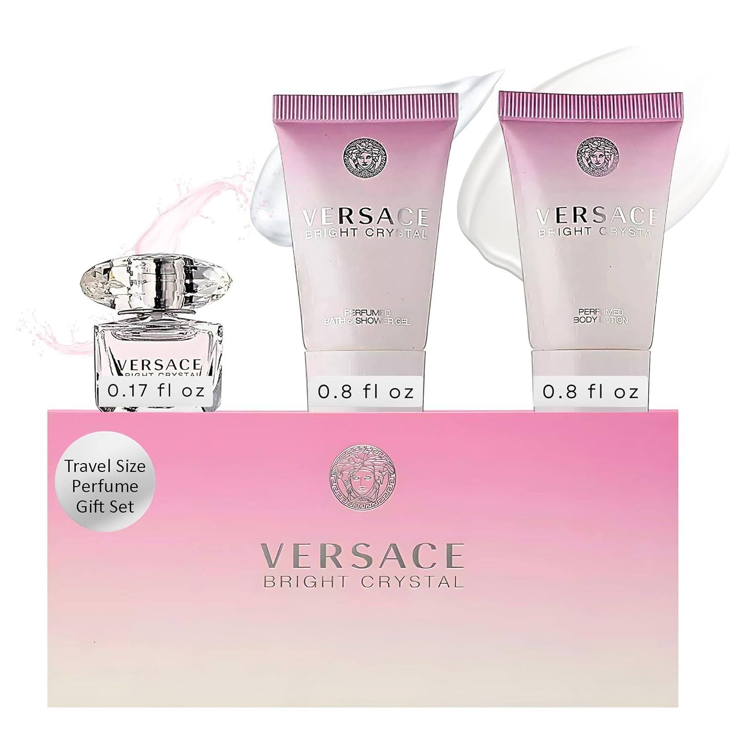 Indulge in the luxurious scent of Versace Bright Crystal with this 3-piece mini gift set for women. Including a 0.17 oz Eau De Parfum Splash, 0.17 oz Perfumed Body Lotion, and 0.17 oz Perfumed Bath & Shower Gel, this set is ideal for travel and TSA approved. Treat yourself or someone special to the essence of sophistication and elegance.