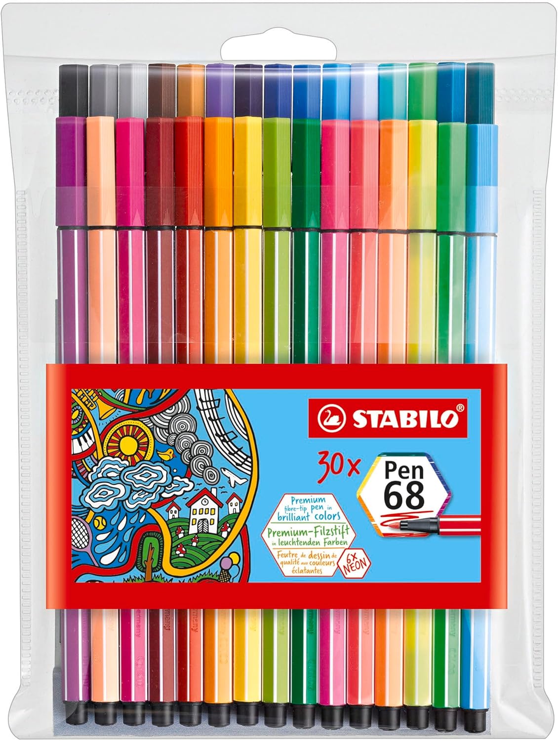 STABILO Premium Fiber-Tip Pen Pen 68 - Pack of 30 - Assorted Colors with 6 Neon Colors, Felt Tip Marker, Fine Point, 1mm Tip