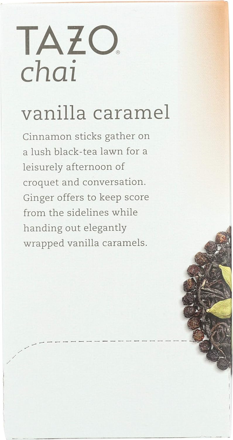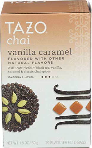El té negro con sabor a caramelo de vainilla tazo chai es una mezcla de té negro con los delicados sabores de la vainilla, el caramelo y las especias clásicas de chai. Cada porción de 8 onzas contiene de 31 a 45 mg de cafeína con nuestros métodos de preparación estándar. Nuestra infusión de té negro tiene un sabor natural, por lo que puedes disfrutar de una deliciosa bebida. Incluye veinte bolsas de filtro de té negro tazo chai con sabor a caramelo de vainilla.