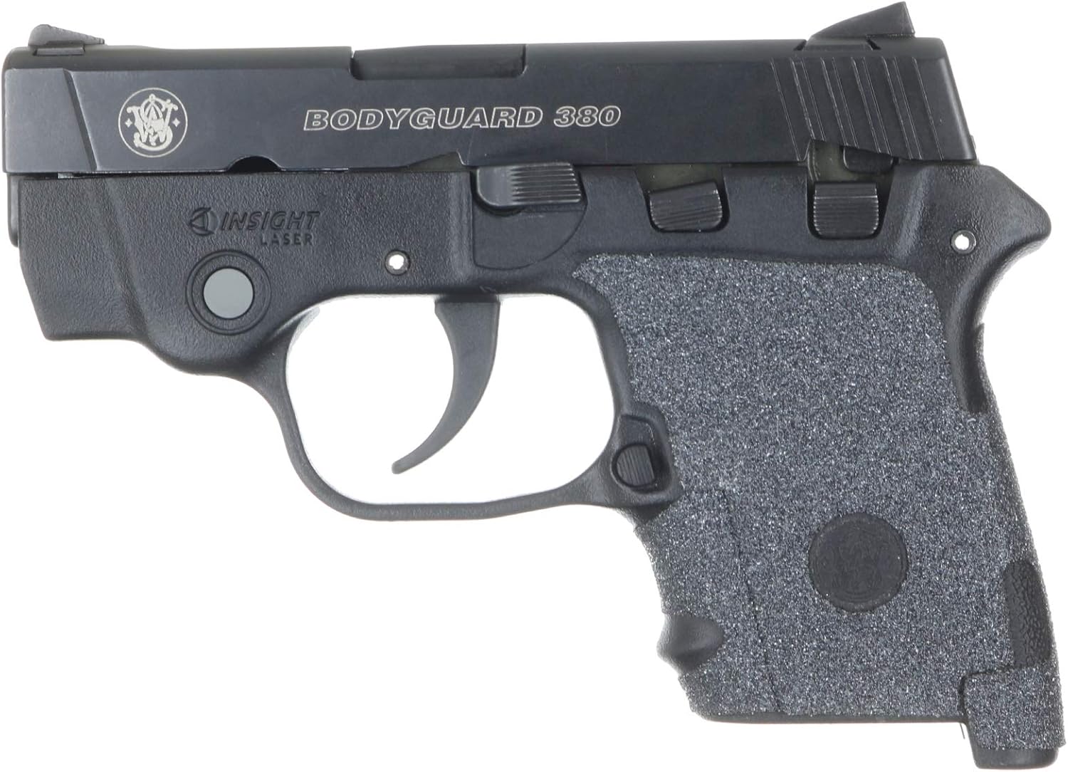 TALON Grips for Smith & Wesson Bodyguard 380 model. This grip also fits the newer M&P Bodyguard 380. This rear wrap grip is available in both granulate and rubber textures and offers full side panel coverage including the thumb rest area, full coverage under the trigger guard, and high coverage on the backstrap. This grip has graphic cutouts for the S&W emblem on each side of the firearm.