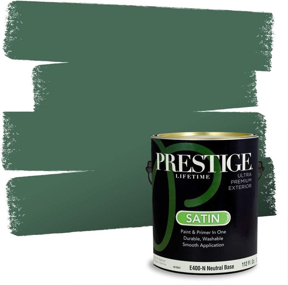 Prestige Paints 100% acrylic exterior latex paint and primer in one is a high end paint that is intended to be used on exterior surfaces including properly prepared wood, masonry surfaces, cement board siding, vinyl*, aluminum, and factory primed siding. (Note: *When painting vinyl siding do not paint with any color darker than the original siding. Painting with darker colors may cause the siding to warp.) Actual paint colors may vary from on-screen and printer representation. Surface Preparation: Remove dirt, mildew, grease, wax and soap residue, loose and peeling paint. Glossy areas must be dulled by sanding. Prime all bare, new wood and factory primed wood with an oil base primer. Prime masonry surfaces including cementious siding with a latex primer. Application: Stir or mix paint before using and intermix all containers for color uniformity. Apply as is with a high quality brush, roller or pad painter. Thin sparingly with water if necessary for spraying. Do not overspread. Temperature must be above 50 F (10 C). Average coverage 400 sq. ft. (37 square meters) per gallon (3.78 L). For best performance, apply two coats of paint on new surfaces after priming. Do not use indoors. Dry Time: Dries in 1 to 2 hours. Allow to dry overnight before recoating. Low temperature or high humidity may increase dry time. Cleanup: Use warm water and soap. Satin finish paints are probably the most commonly used finish on exterior surfaces. Satin finishes resist mildew effectively and are easier to clean than flat or eggshell finishes, and can be wiped down or scrubbed lightly. On exterior surfaces, satins are ideal for painting siding that is in good to excellent condition. Outside surfaces painted with satin paint also shed water effectively and don't fade quickly from the sun. They are also a good choice for painting trim and shutters.