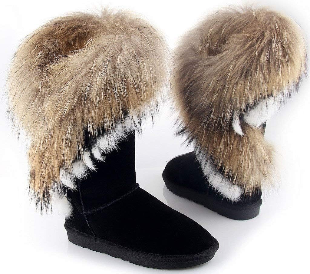 APHNUS Womens Mid Calf Boots Cow Leather Fur Snow Boots
