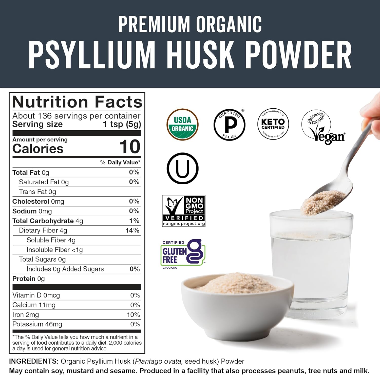 Viva Naturals Organic Psyllium Husk Powder, 24 oz – Finely Ground, Unflavored, Vegan, Keto, Paleo, Non-GMO Plant-Based Superfood, Good Source of Fiber for Gluten-Free Baking, Juices & Smoothies