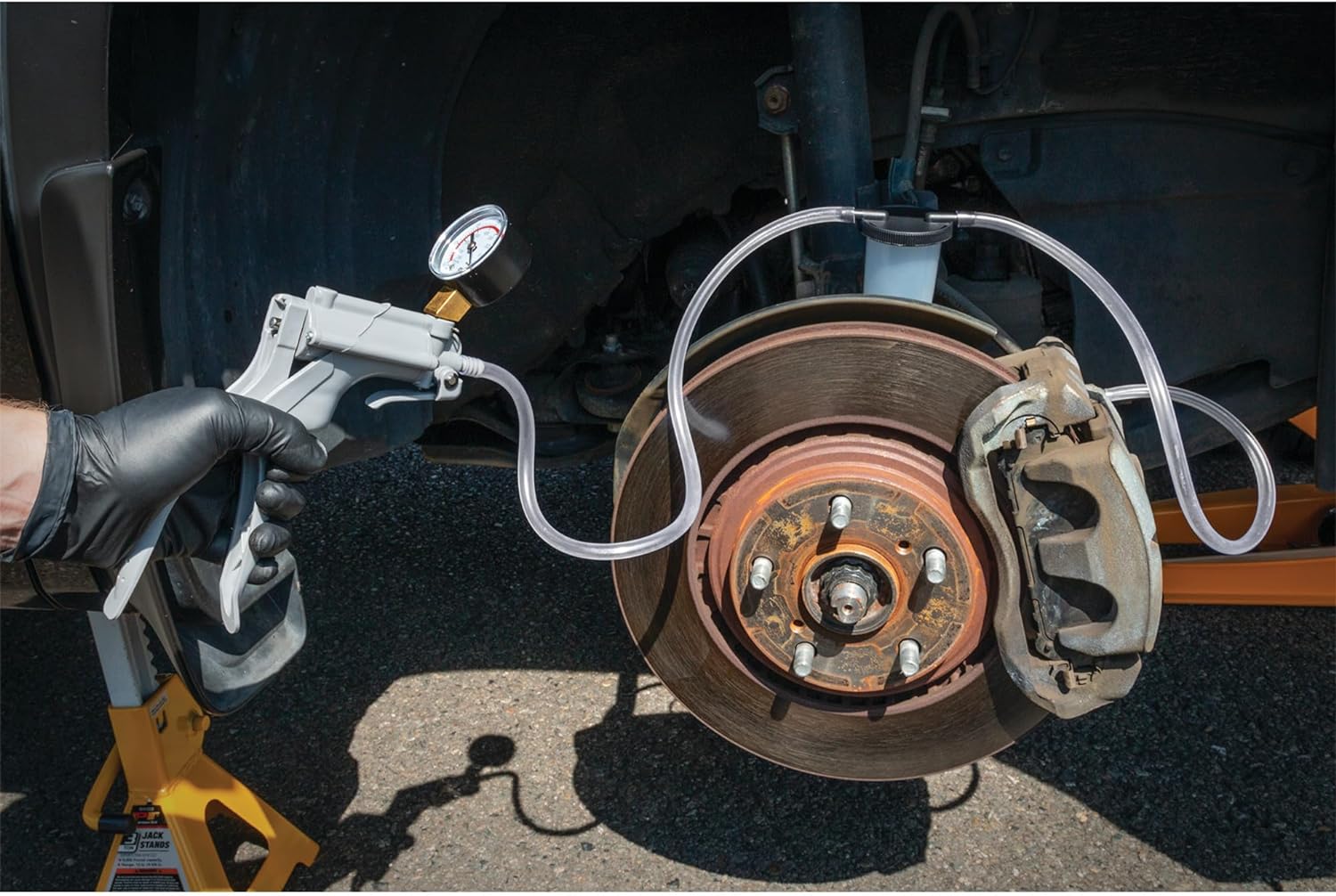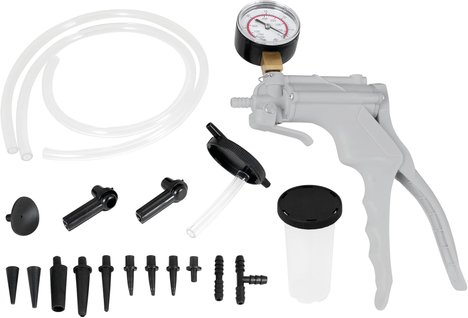 This Performance Tool W87030 Hand Vacuum Pump Kit is an all-in-one solution for brake bleeding and automotive testing. With a wide range of applications, this kit includes accessories for both brake bleeding and automotive diagnosis, making it a versatile addition to any garage or workshop. The vacuum gauge scales in Inches of Mercury (Hg) to provide precise and reliable results in testing and diagnostic work. The pump can develop and hold up to 25 inches of vacuum (Mercury Hg) and pumps approximately 1 cubic inch per stroke, making it easy and efficient to use for both professionals and DIYers. Diagnose vacuum problems, bleed brakes and more with this brake bleeder kit.