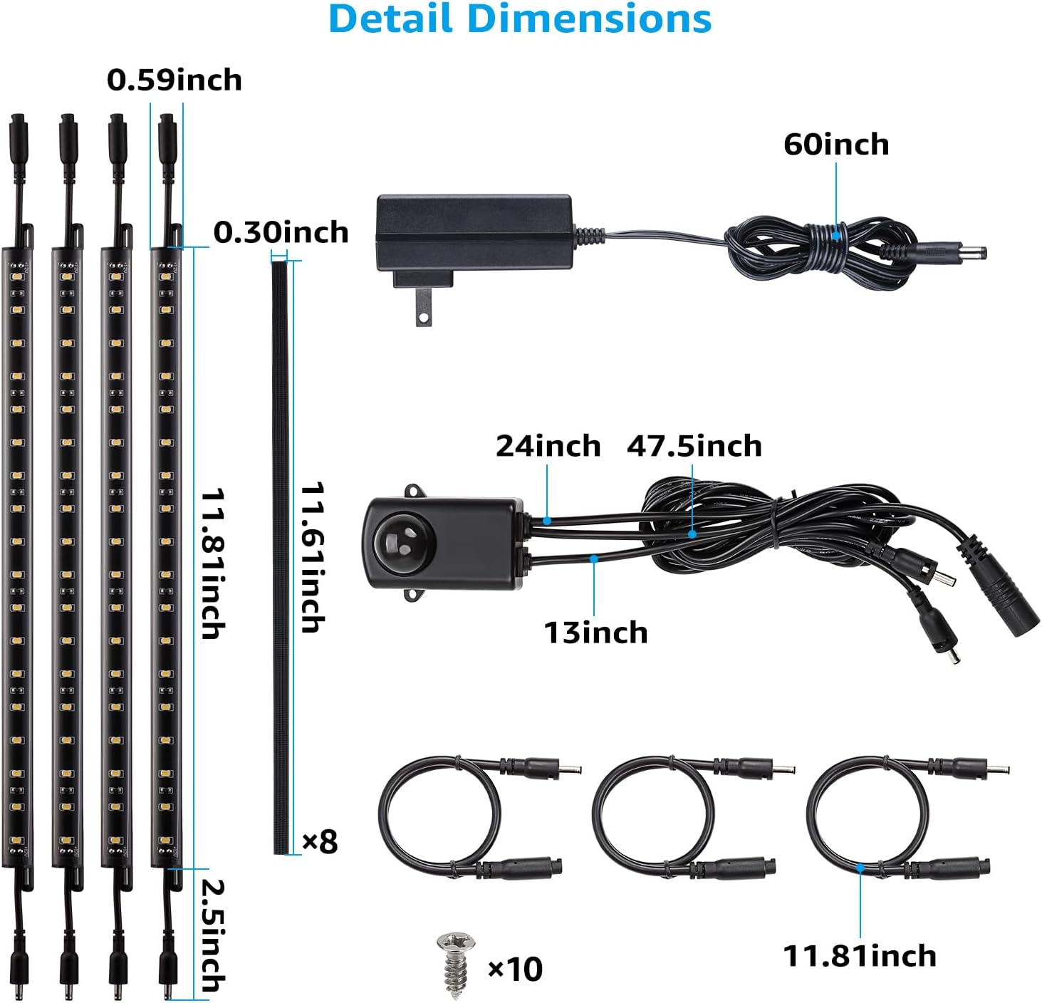 NO.1 Best-Selling LED lighting kit on Amazon: 12’’ LED light bars + motion sensor + UL-Listed A/C Power adapter + (3)extra 12’’ extension cables + (8) hook and loop fasteners + (10) screws