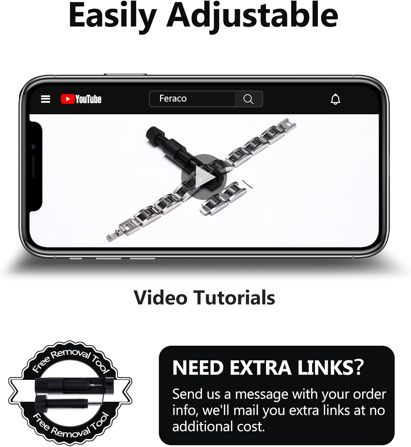 Easy To Adjust: Length: 8.66 inches (22 cm); Width: 0.43 inches (1.1 cm); Weight: 55 g. Comes with a free velvet jewelry box, soft cloth, and links removal tool that allows you to resize it easily at home.