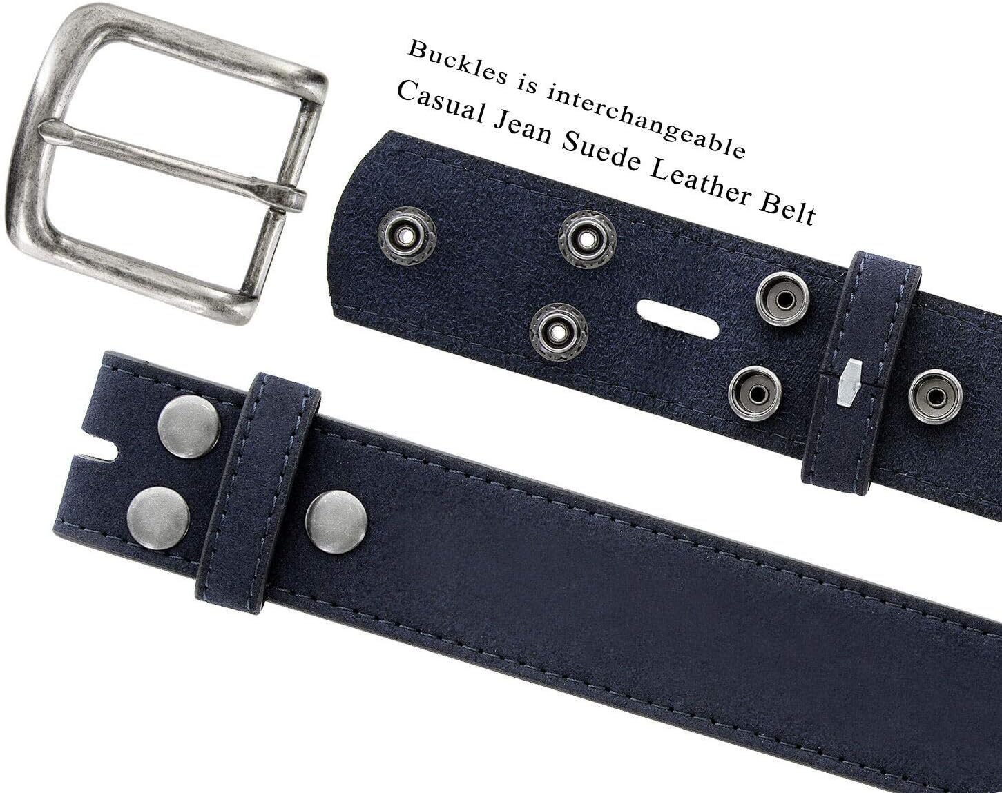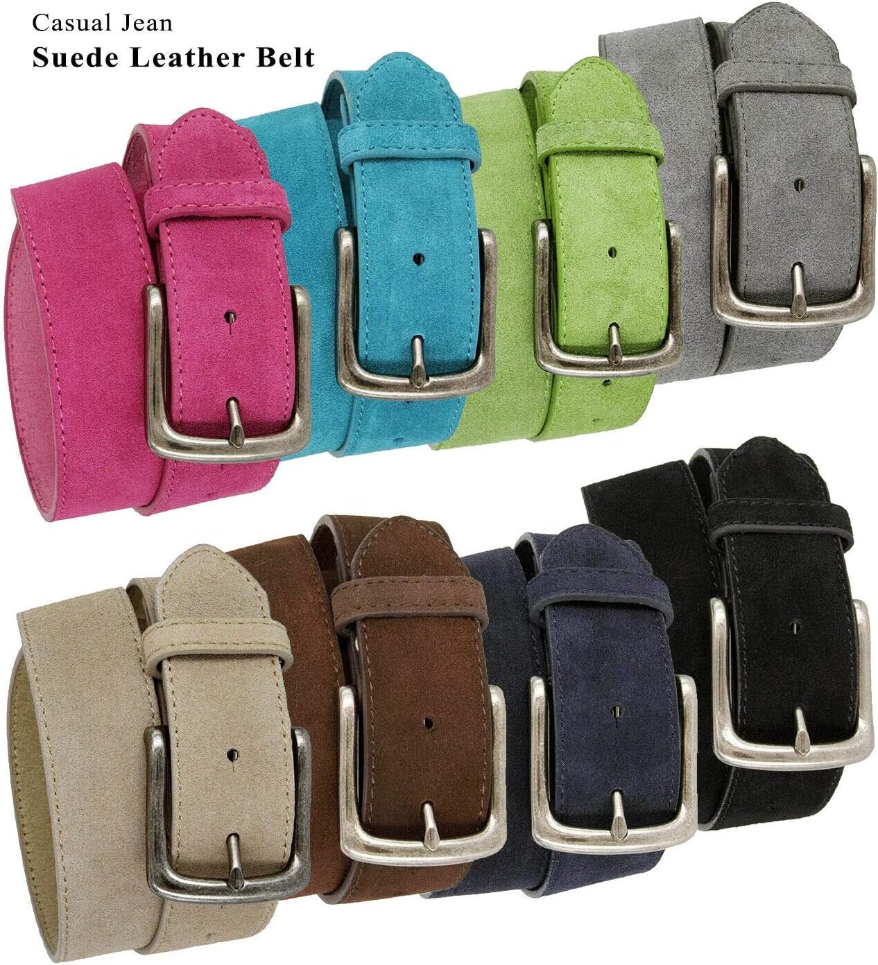 Made from genuine suede leather and comes with an antique silver colored rounded edge heel bar buckle.Available in 8 different vibrant colors and feels smooth like velvet.Convenient snap system for interchanging buckles in case you want to switch to a different buckle.1.5 inches wide. Comes with 7 belt holes for plenty of room for adjustments.Our belts are measured from the fold where the buckle is to the middle hole. If you want to get your best size, measure a belt the works for you from the fold to the hole where you wear the belt.