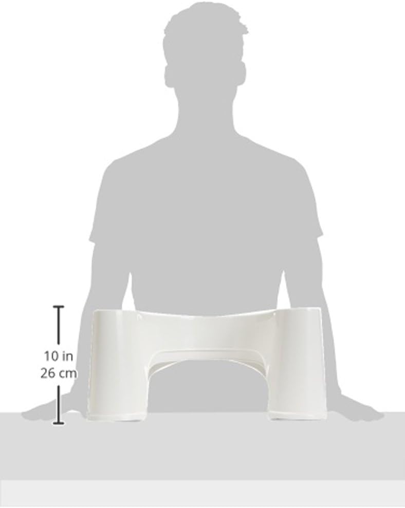 The Squatty Potty is a wonderful health aid for the entire family. The Squatty Potty helps you to eliminate faster and more complete by putting your body into a natural squatting position over your own toilet. Using the Squatty Potty during elimination will un-kink your rectum taking your body from a continent mode to an elimination mode. This will speed up the elimination process therefore reducing the risk of toxic build up of fecal matter left in your colon. Using the squatty potty for elimination will reduce straining and decreases the pressure in the anal and rectal veins. The reduction of straining will help to heal and prevent hemorrhoids. It will also reduce the risk of bowel herniation and other damage to the lower digestive tract. The Squatty Potty is attractive and will discretely tuck under your toilet bowl when not in use. Its designed with a forward slant to ergonomically align the body for a comfortable and complete elimination. Children love the Squatty Potty. It is an excellent toilet training aid. It provides them with a place to support their feet which helps to remove the fear of falling. They also don't have a need to hold onto the dirty toilet seat for balance. The White Plastic Squatty Potty is very durable, and easy to clean. Made of durable hard Polypropylene plastic. It is 7 3/4" high at the back and has a slight forward slope to 6 3/4" in the front. The Squatty potty is not a stepping stool and should only be used around the base of your toilet.