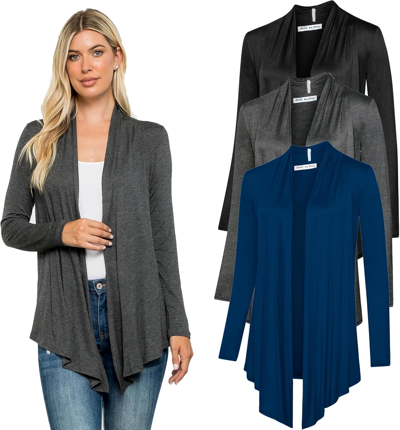 Free to Live 3 Pack Long Sleeve Cardigan for Women Open Front Dressy Casual Fall Draped Lightweight Sweaters Cover Up Shrugs