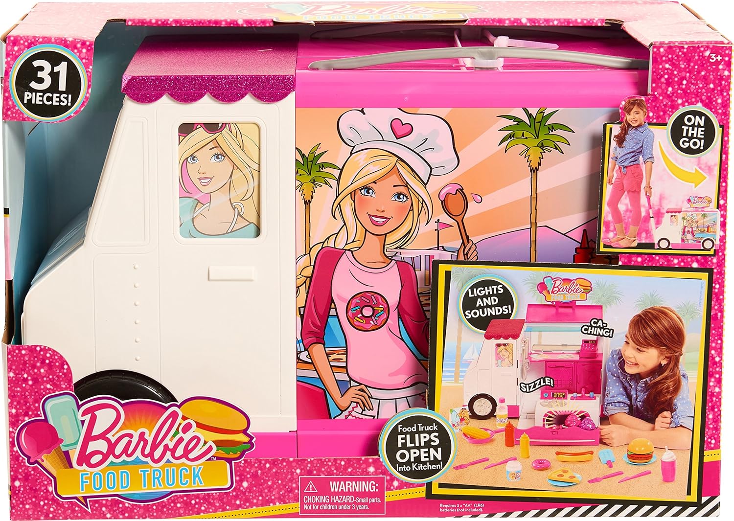 You can be a Chef! The Barbie Food Truck is perfect for every little foodie with big dreams! The truck opens up to reveal 31 play cooking tools and food pieces and has lots of fun features like a light up oven and sizzling grill! Open up the awning and display your menu sign when you're open for business! The truck comes with built in shelves to display all of your delicious food and a cash register with sound for ringing up your customers! When you're done serving fabulous food in style, just close up the truck, pull up the handle and take it with you on the go!