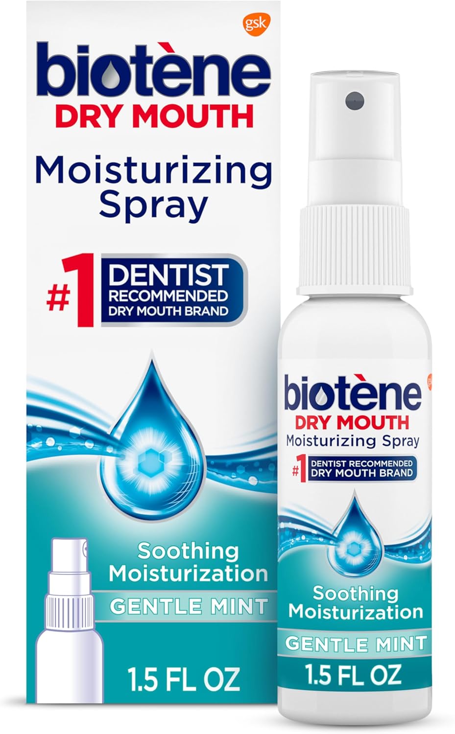 Biotene Gentle Mint Moisturizing Dry Mouth Spray is a quick, on-the-go solution that gives you instant dry mouth symptom relief. This soothing moisturizing spray provides up to four hours of relief from dry mouth symptoms, including bad breath, stickiness in the mouth, dryness in the mouth and chapped lips. This alcohol-free and sugar-free oral spray has a mild mint flavor that freshens breath as it moisturizes. Packaged in a small 1.5 oz bottle, this Biotene spray is the perfect size to tuck in your purse, backpack or travel bag for an on-the-go breath freshener and mouth moisturizer. Simply spray Biotene dry mouth spray directly into the mouth, onto the tongue, and spread thoroughly inside the mouth. Adults and children 12 years and older may use this breath spray as needed. For long-lasting relief of dry mouth symptoms, choose Biotene, the Number 1 dry mouth brand trusted by dentists.