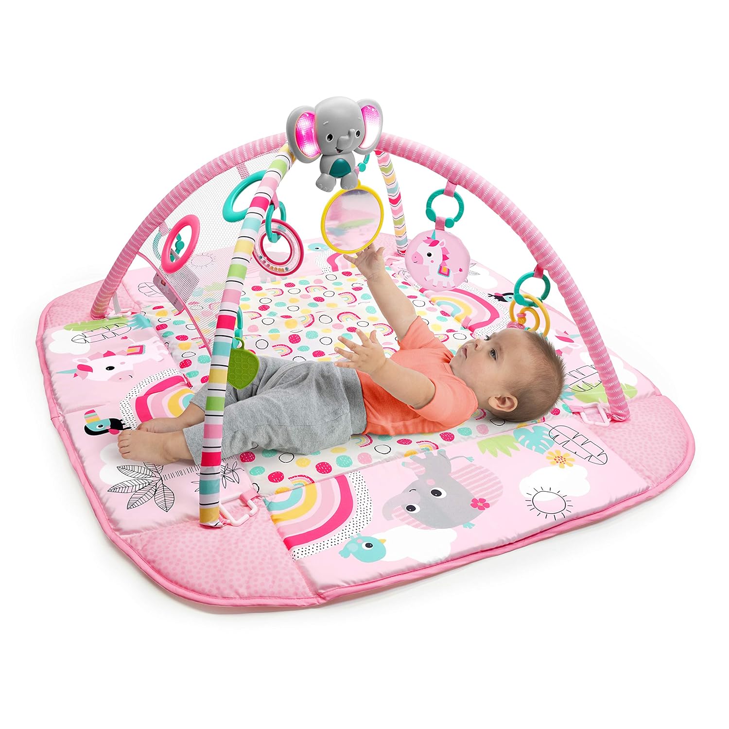 Includes 7 tropically cool take-along toys: elephant Musical toy, Unicorn crinkle toy, mirror, flash cards, hanging leaf toy and bead rattle