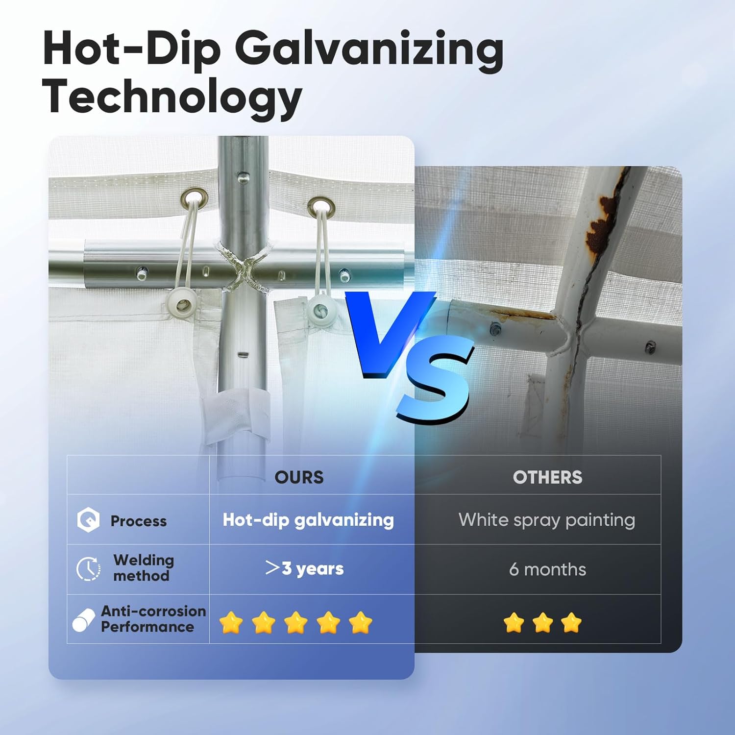 【Sturdy Steel Frame】Our party tent features a high-quality, heavy-duty 38mm galvanized steel tube frame that is corrosion-resistant. With a steel tube diameter of 1.5 inches (38 mm) and a metal connector diameter of 1.66 inches (42 mm), you can be sure of strong support.