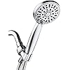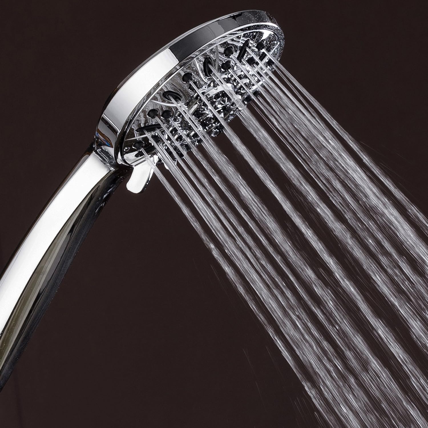 AquaDance 6-Setting Oversized 4-Inch Chrome Face Hand Held Shower Head Stainless Steel Hose - offers the Ultimate Shower Experience! You will love Ergonomic Grip Handle of this handheld showerhead and SIX FULL WATER SPRAY SETTINGS that are truly different! Click-Lever Dial makes it easy to change from one setting to another while RUB-CLEAN JETS make cleaning your shower head easy and effortless! Water Saving Pause Mode is great for saving water in RVs and boats. Premium Easy-to-Open Packaging – your order will arrive in an easy to open premium recyclable box that protects your product during shipping. No hard to open plastic casings, plain brown boxes or cheap poly bags! Each box contains a Premium 4-Inch Chrome Face Handheld Shower Head, Super-Flexible Stainless Steel Shower Hose, Angle-Adjustable Overhead Bracket, Free Washers and Teflon Tape. Detailed easy-to-follow Installation Manual makes the installation process trouble-free and perfect! Every shower head comes with hassle-free easy to register LIMITED LIFETIME WARRANTY! Contact us via Amazon or call our Customer Service and we will be happy to help you! Get AquaDance Premium Shower Head for EVERY bath in your home! Product Information Use as Overhead or Handheld Shower! Oversized 4-Inch Chrome Face Six settings: Power Rain, Pulsating Massage, Power Mist, Rain Massage, Rain Mist, Water Saving Pause Mode Ergonomic Grip Handle Three-zone click-lever dial Rub-Clean Jets for easy maintenance Angle-Adjustable Overhead Bracket 5 Foot Super Flexible Stainless Steel Shower Hose Brass hose nuts allow for hand-tightening Free Teflon Tape included Tool-Free Installation, no assembly required Limited Lifetime Warranty