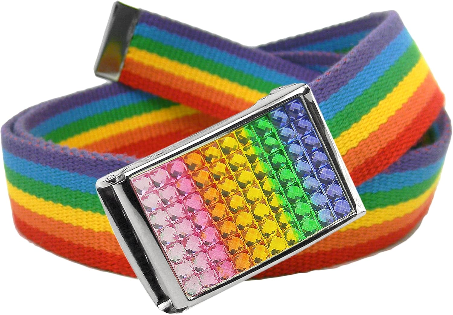 Rainbow rhinestone flip top style buckle with canvas web beltThis buckle is 1.25" wide (standard military width), flip-top clamp style, which are easy to use and won't slide out.Our web belts are made from high quality, color fast weaved polyester cotton blend which won't fray and is very durable. Glitter webbing has a cross thread of colored foil wrap, which gives the belt color the shinny look. Checkerboard is a sublimation print.