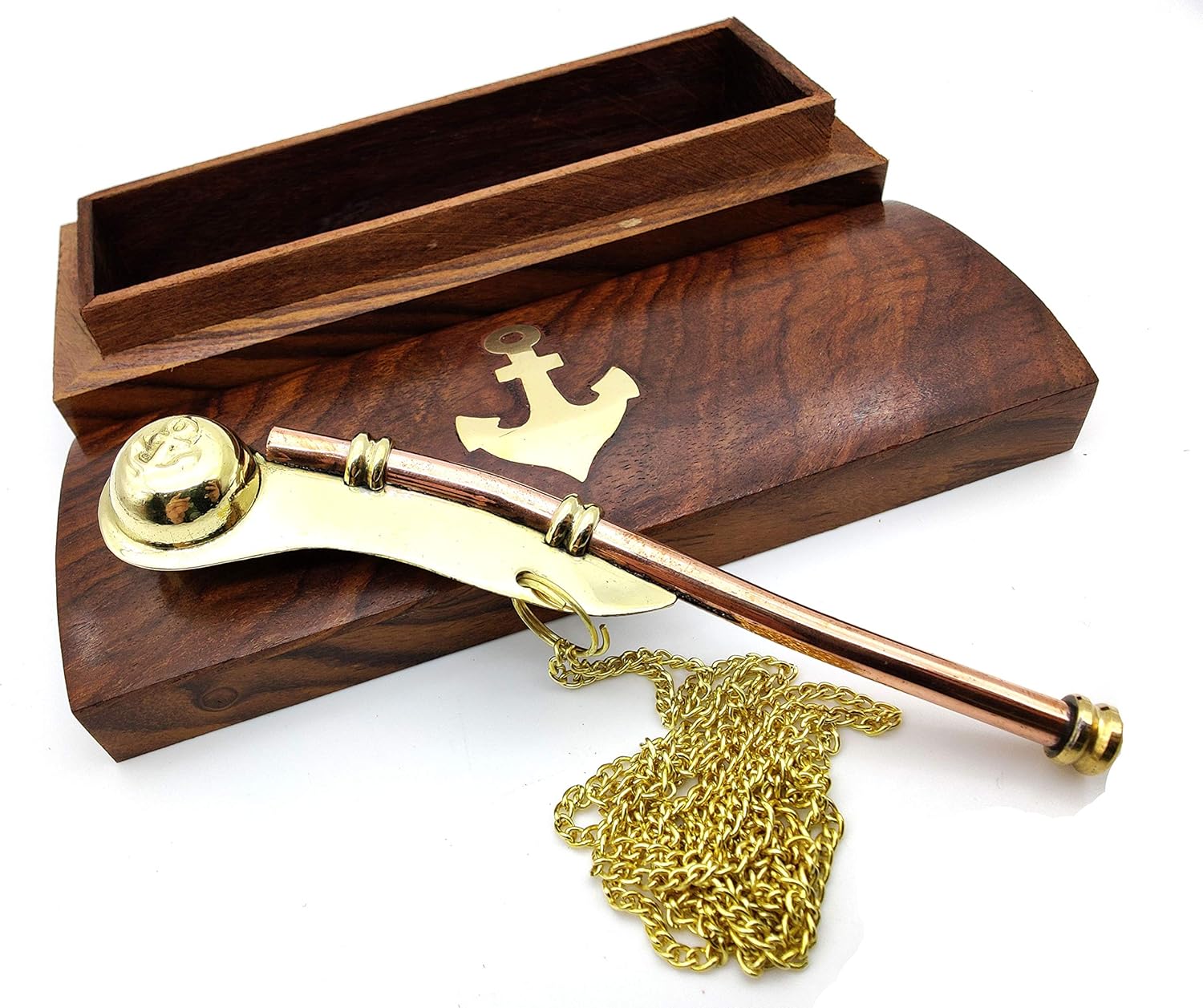 The Nautical Boatswain's Pipe (bosun's Pipe) is one of the oldest and most distinctive pieces of nautical equipment. The boatswain's pipe, whistle, or flute, was used in Greece and Rome to keep the stroke of galley slaves. This beautifully detailed solid brass and copper Navy Boatswain's Pipe comes with a quality 35 inch solid brass chain lanyard. The pipe has a traditional anchor design inlaid in copper on both sides. The boatswain's pipe measures 5 inches (12.7 cm) long, and the pipe and chain weigh 1.6 ounces (45 grams), and yes, it really whistles.The boatswain's pipe comes with a beautiful solid hardwood felt lined storage and display case. Solid brass and copper no plastic parts 35” chain lanyard brass links keep whistle secure Traditional design of a bosun’s pipe Fully functional actually works