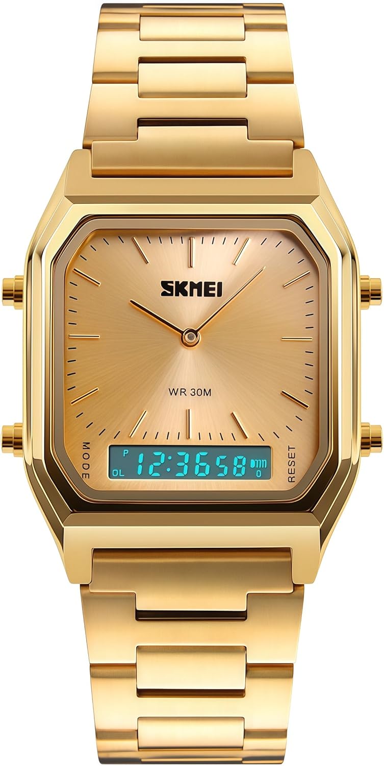 Género: hombre Estilo: simple, moderno, deportivo Movimiento IC de Taiwán Colores: oro rosa, plata, azul, negro Material de la caja: aleación de zinc Material de la correa: correa de acero inoxidable Tipo de hebilla: hebilla Reloj de esfera: cuadrada Diámetro de la esfera: 33 mm Grosor de la caja: 11 mm Ancho de banda: 22 mm Profundidad de resistencia al agua: 30 ATM Funciones: doble pantalla, luz EL, fecha, cronógrafo, alarma Características: pantalla doble, reloj de cuarzo digital, resistente al agua