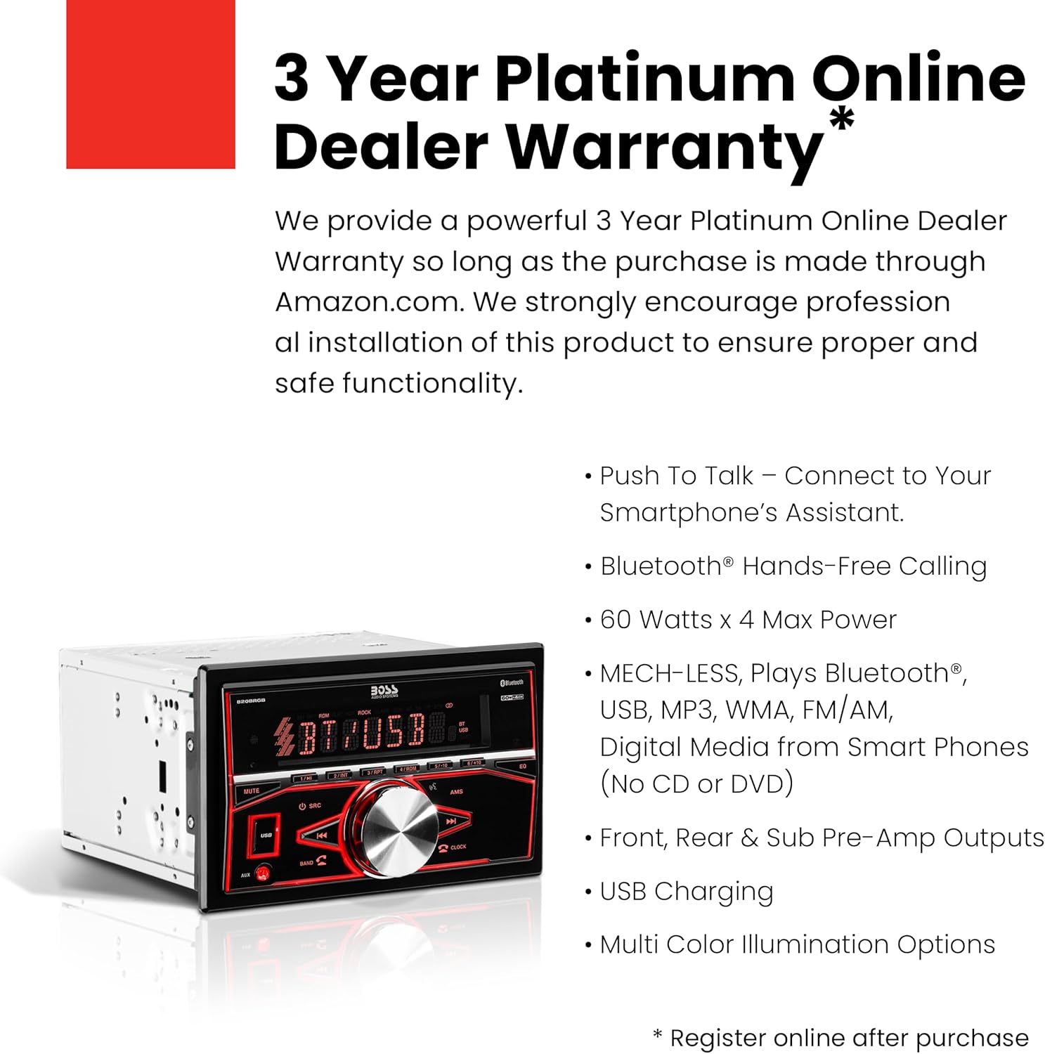 BOSS Audio Systems ofrece una potente garantía Platinum Online de 3 años por parte del distribuidor siempre que la compra se realice a través de Amazon.com. Recomendamos encarecidamente la instalación profesional de este producto para garantizar un funcionamiento adecuado y seguro