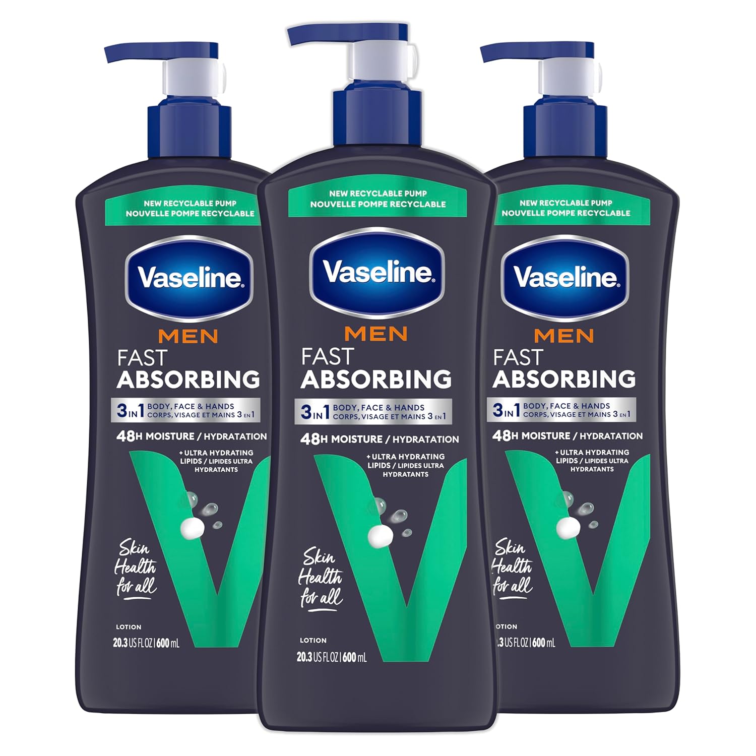 Loción para manos y cuerpo Vaseline Men's Healing Moisture para piel seca o agrietada, loción de absorción rápida y no grasa para hombres, 20.3 oz, paquete de 3