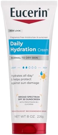 La crema hidratante diaria Eucerin SPF 30 proporciona hidratación durante 24 horas a la piel seca mientras la protege de las quemaduras solares y el daño cutáneo a largo plazo con protección de Espectro Amplio UVA/UVB. La luz UV es la principal causa del daño cutáneo inducido por el sol y un factor de riesgo importante para la mayoría de los cánceres de piel. Esta crema hidratante protectora solar de absorción rápida para piel seca no es grasa y está enriquecida con Pro-Vitamina B5 y aceite de girasol. Esta crema corporal Eucerin para piel seca es un hidratante y protector solar 2 en 1 ligero que no contiene fragancia ni tinte, y el protector solar SPF 30 es seguro para pieles sensibles. Este hidratante corporal SPF es perfecto para aquellos que buscan un protector solar corporal para piel seca que ayude a proteger la piel de las quemaduras solares y el daño cutáneo a largo plazo cuando se usa según las indicaciones. Para el uso como protector solar, aplique esta crema solar Eucerin de manera liberal 15 minutos antes de la exposición al sol. Use un protector solar resistente al agua si nada o suda. Vuelva a aplicar al menos cada 2 horas. Eucerin es una marca de cuidado de la piel recomendada por dermatólogos que se basa en un enfoque intransigente con la ciencia. Con productos para el cuidado de la piel diseñados para restaurar y mantener una piel sana y con aspecto saludable, las familias de todo el mundo confían en Eucerin para mejorar la belleza externa y la confianza en sí mismos.
