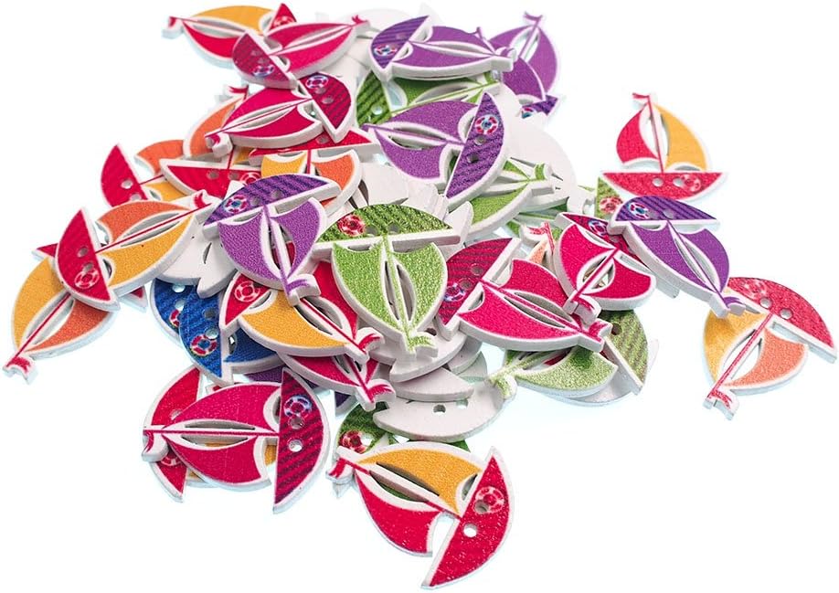 RayLineDo® Pack of 50pcs Buttons Multi Color Sailboat Shaped 2 Holes Wooden Buttons for Sewing and Crafting