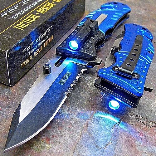 Navaja de bolsillo TAC Force Blue para rescate táctico con LED abierto y asistida por la policía (paquete básico)