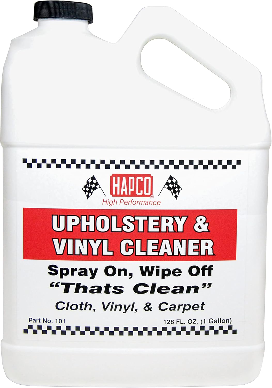 Hapco Vinyl & Upholstery Cleaner is an all-purpose cleaner that delivers fast results. It is formulated to be gentle enough to use on fabric, carpet and painted surfaces, yet strong enough to be used on grease and dirt. It quickly cleans any surface and does not discolor fabric. Contains a fresh, mild fragrance. For Best Results: Apply Vinyl & Upholstery Cleaner onto desired area, let sit for 5 minutes, then wipe clean. For a deeper clean, scrubbing is recommended. Note: Gallon does not include spray bottle.