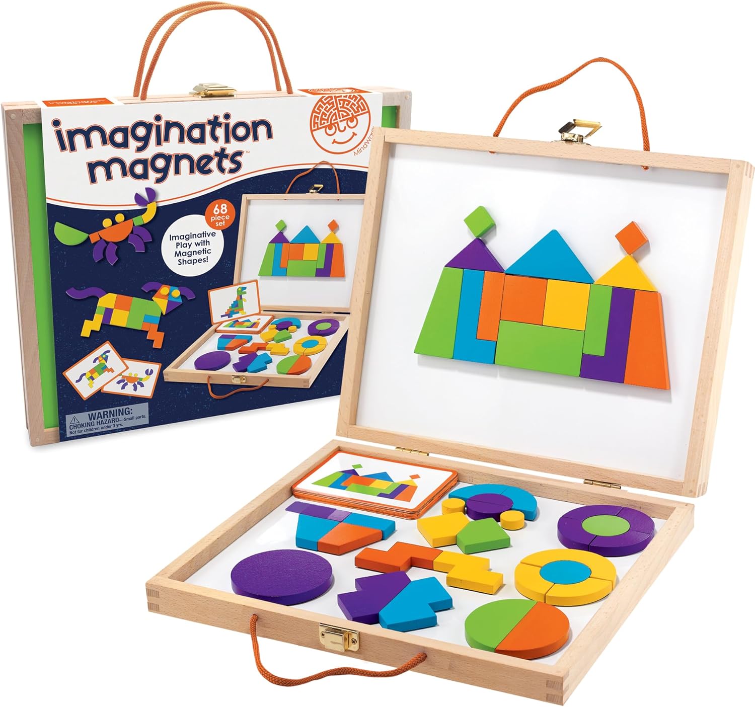 MindWare Imagination Magnets Wooden Pattern Blocks Set - Imaginative Play with magentic Shapes in a Carrying case - 42 Magnetic Solid Wooden Blocks, 50 Full-Color Laminated Puzzles