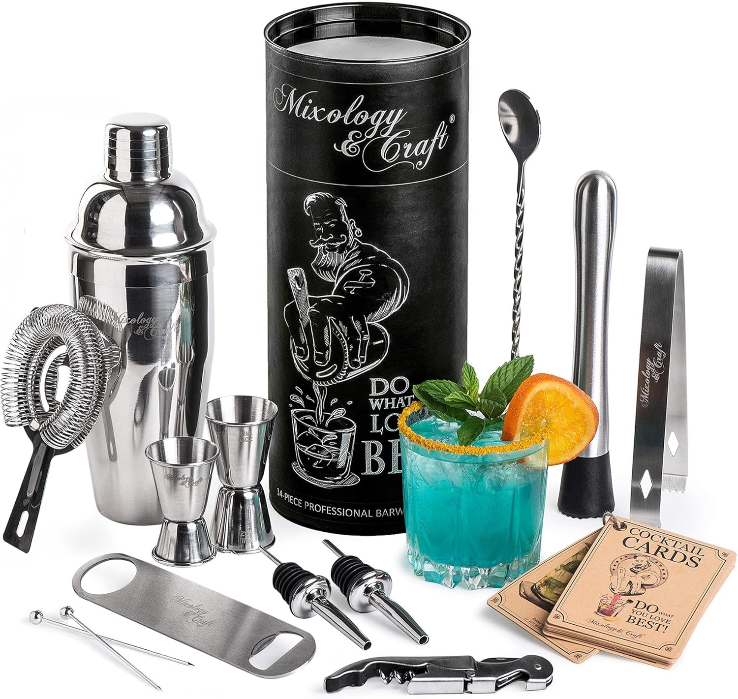 Mixology Barman Kit: Juego de coctelera de 14 piezas - Juego de herramientas de bar para barman en casa y profesional - Juego de coctelera Martini con herramientas de barra para mezclar bebidas - Selecciones de cóctel exclusivas y recetas de regalo