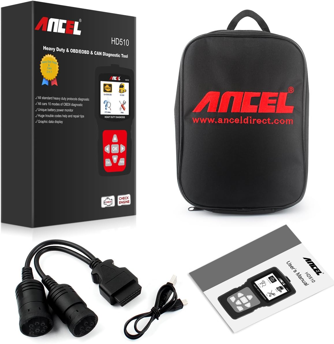 ANCEL HD510 is a professional Automotive Diagnostic Scanner for both cars and trucks. For cars and light trucks, it supports all obd2 protocols (J1850 PWM, J1850 VPW, ISO9141, KWP2000 and CAN ), helps to read and erase fault codes, graph live data display, retrieve vehicle information, EVAP Test, O2 Sensor Test and so much more; For Trucks, it supports standard truck protocols ( J1578, J1939 and J1708), easily to read codes for check engine light, oil light, transmission, brake etc and shows live data. Key Features: Works on most 12V cars, light trucks and 24V heavy duty trucks for 1996 US-Based, 2005 EU-Based and Asian vehicles Supports car and light truck OBDII protocols ( J1850 PWM, J1850 VPW, ISO9141, KWP2000 and CAN) Supports truck standard protocols (J1578, J1939 and J1708) Uniquely featured with battery power monitor function Read and erase generic codes (P0, P2, P3 and U0), manufacturer specific codes(P1, P3 and U1) and pending codes Displays DTC definition, freeze frame data, monitor and I/M readiness status (emissions), and vehicle information (VIN, CIN and CVN) Read PCM live data stream with graphic data Display Enhanced OBDII Mode 6 Heavy Duty Truck Supported: Cummings, Detroit, Kenworth, Caterpillar, Freightliner, International, John Deere, Peterbilt, Sterling, Mack, Mecedes Benz, VOLVO, Scania, ISUZU, Brilliance and more diesel trucks. Packing List: 1 x HD510 scanner 1 x 6PIN connector 1 x 9PIN connector 1 x user's manual 1 x Nylon Carry Bag