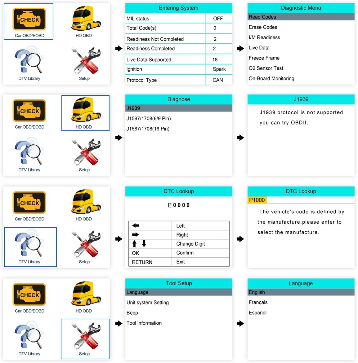 Supports English, French and Spanish; Shows car or truck's voltage, you know ahead of car battery system health status before bringing the car for repair.