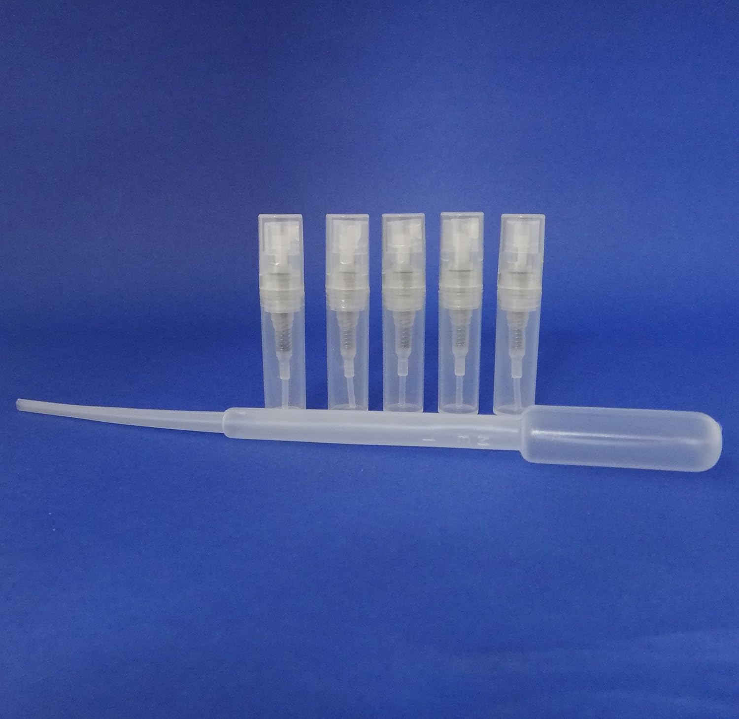 Botella de spray de plástico mini de viaje recargable para perfume Tamaño: 1.2 cm de diámetro x 5.6 cm de altura Cantidad: 10 piezas Capacidad: 2ml Material: Plástico de polipropileno (PP) Color: Transparente Bono: ¡Una pipeta de transferencia con cada pedido!!