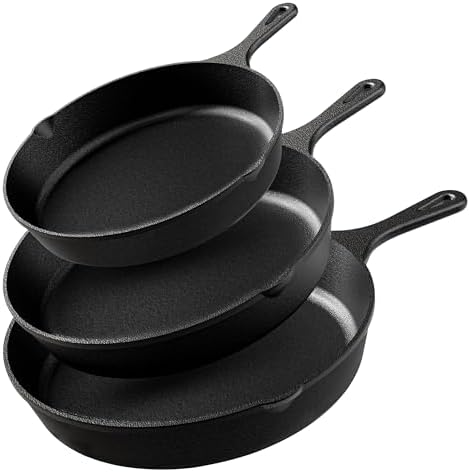 Utopia Kitchen Sartén de Hierro Fundido 3 Piezas, Sartén de Chef, Sartén de Hierro Pre-Acondicionado, 6, 8 y 10 Pulgadas, Fácil Uso en Horno, Estufa, Parrilla o Fogata, Negro