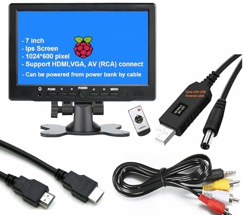 Monitor 7 pulgadas HDMI VGA AV RCA 1080P Pantalla Secundaria para PC/Sistema de Seguridad/Consola de Juego; IPS 1024X600 Pixeles; 60HZ; Altavoces Integrados y Conector para Auriculares; Cable de Alimentación USB 12V para Uso Portátil