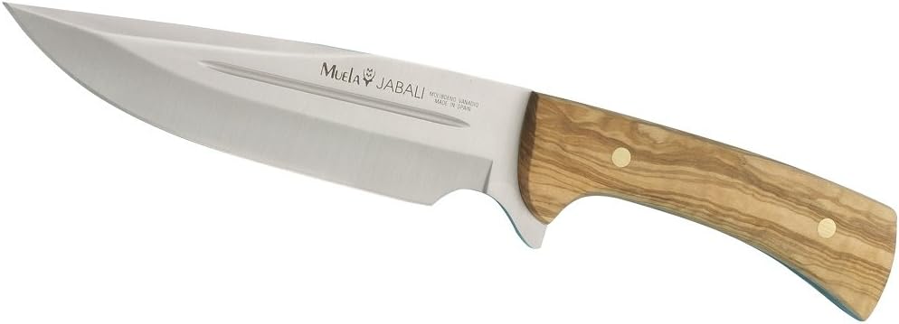 Cuchillo de caza MUELA JABALI-17OL con hoja X50CrMoV15 (1. 4116 acero inoxidable alemán) de 6,75 pulgadas. Cuenta con mango de madera de olivo. Longitud total 11. 75 pulgadas. Viene con funda de cuero de plena flor y MUELA Lifetime.