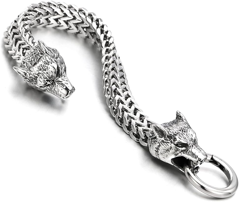 COOLSTEELANDBEYOND Biker Mens Stainless Steel Wolf Head Franco Link Curb Chain Bracelet with Spring Ring Clasp
