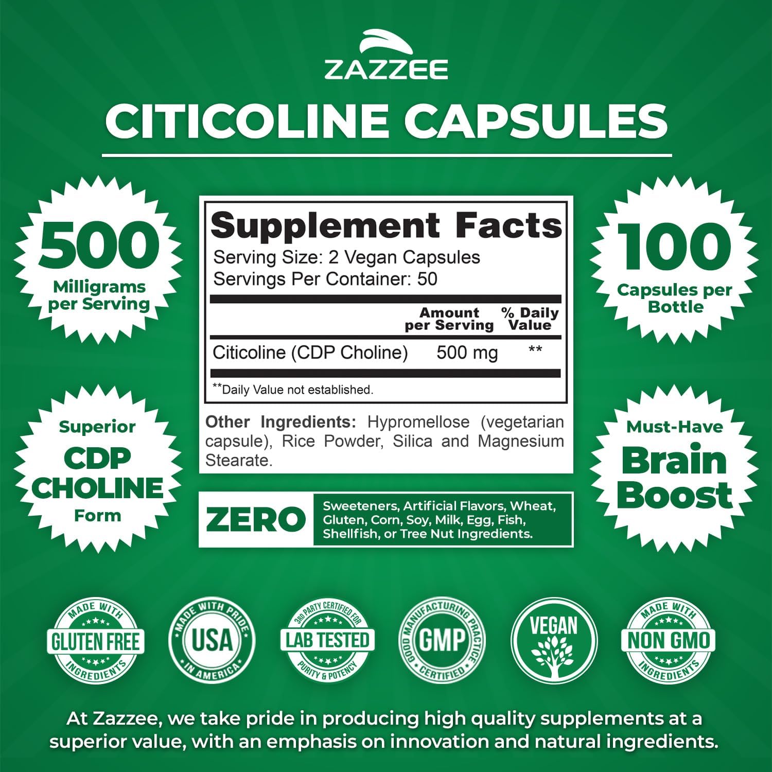 Zazzee Extra Strength Citicoline, 500 mg por Porción, 100 Cápsulas Veganas, Forma Superior de CDP Colina, 100% Vegetariano y Grado Farmacéutico, Suministro de 50 Días, Todo Natural y No OGM