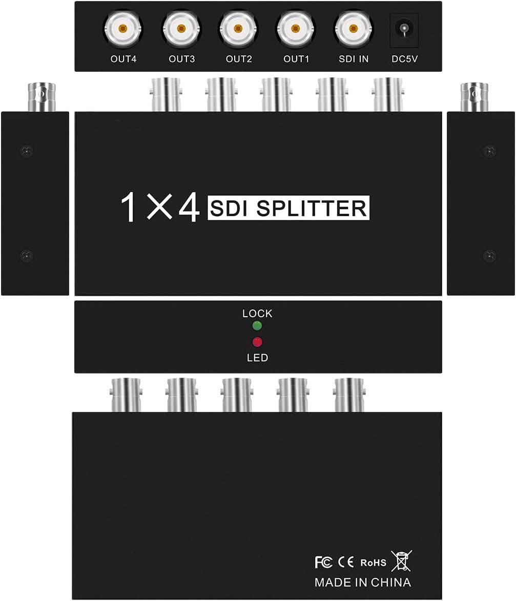 SDI Splitter 1x4 Multimedia Split SDI Extender Adapter Support HD-SDI, SD-SDI and 3G-SDI Signals for Projector Monitor Camera(1 sdi Input and 4 sdi Output