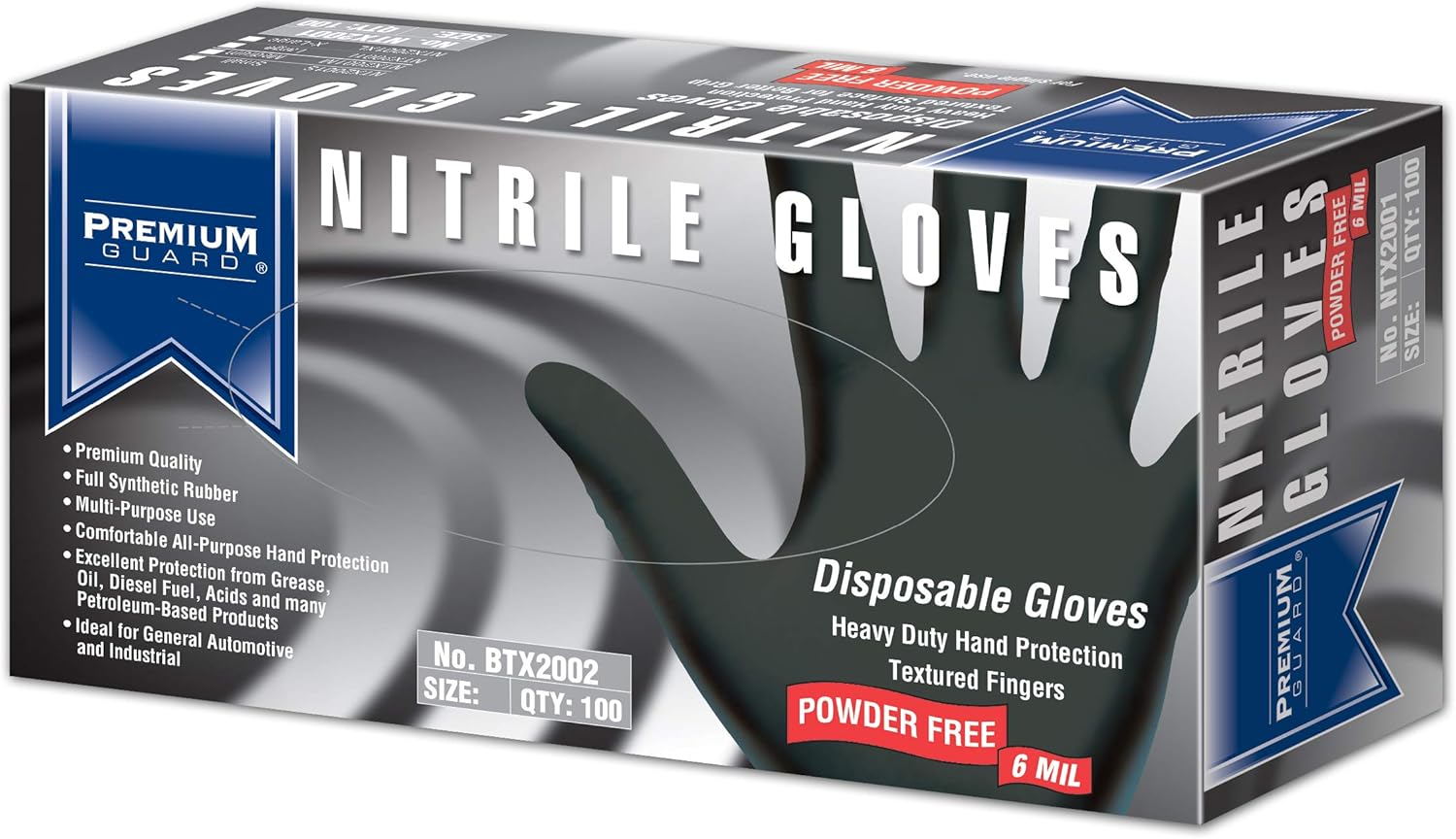 Premium Guard Nitrile Gloves - Disposable, Powder Free, Latex Rubber Free, 6 mil, Black, 100 Gloves Per Box