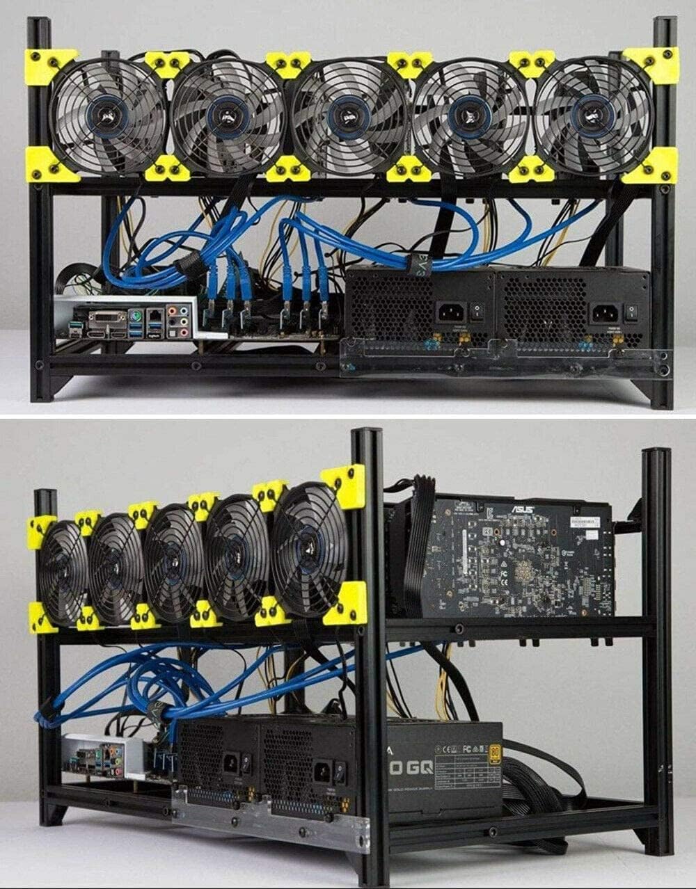6 GPU Mining Aluminum Case Rig Open Air Frame for Crypto Coin Currencystandard aluminum alloy profiles, strong and durable, full protection of graphics cards and electronic devices, can be firmly superimposedwide body heat dissipation design, greatly increase the distance between the graphics cards, ensure good heat dissipation effect, easy installation and maintenanceStackable open air design, perfect for any type of GPU scrypt mining such as Litecoin, Dogecoin, Earthcoin, etc. Also great for Bitcoin ASICs.Keep your video cards extra cool with this open air design. Plenty of room between cards allow airflow.standard aluminum alloy profiles, strong and durable, full protection of graphics cards and electronic devices, can be firmly superimposedFeatures:1. Brand new Aluminum Alloy material body2. 6 GPU Enhanced 3. Generous space between the GPUs, making them Cool n Quiet.4. Full Anodized Aluminum Alloy, precision crafted for the pro miners, with love.5. Support ATX/MATX Motherboard.6. Support Single or Dual PSU hosting, hard drive, PSU mounting Kit.7. Support Five 12CM Computer Fan mount position8. Support Dual PSU.9. Size:365 mm x 640mm x 380mm10. Support up to 32CM GPU Package Included:1set Open Air Frame (ONLY FRAME)Warranty: 1 Year Warranty and 30-Day Return GuaranteeNote:This listing DOES NOT include CPU, GPU, PSU, Fans,Motherboards, RAMs, or any cables. Please contact us first when you have any problem,we will give you the best service and solve the problem ASAP.Thank you so much.