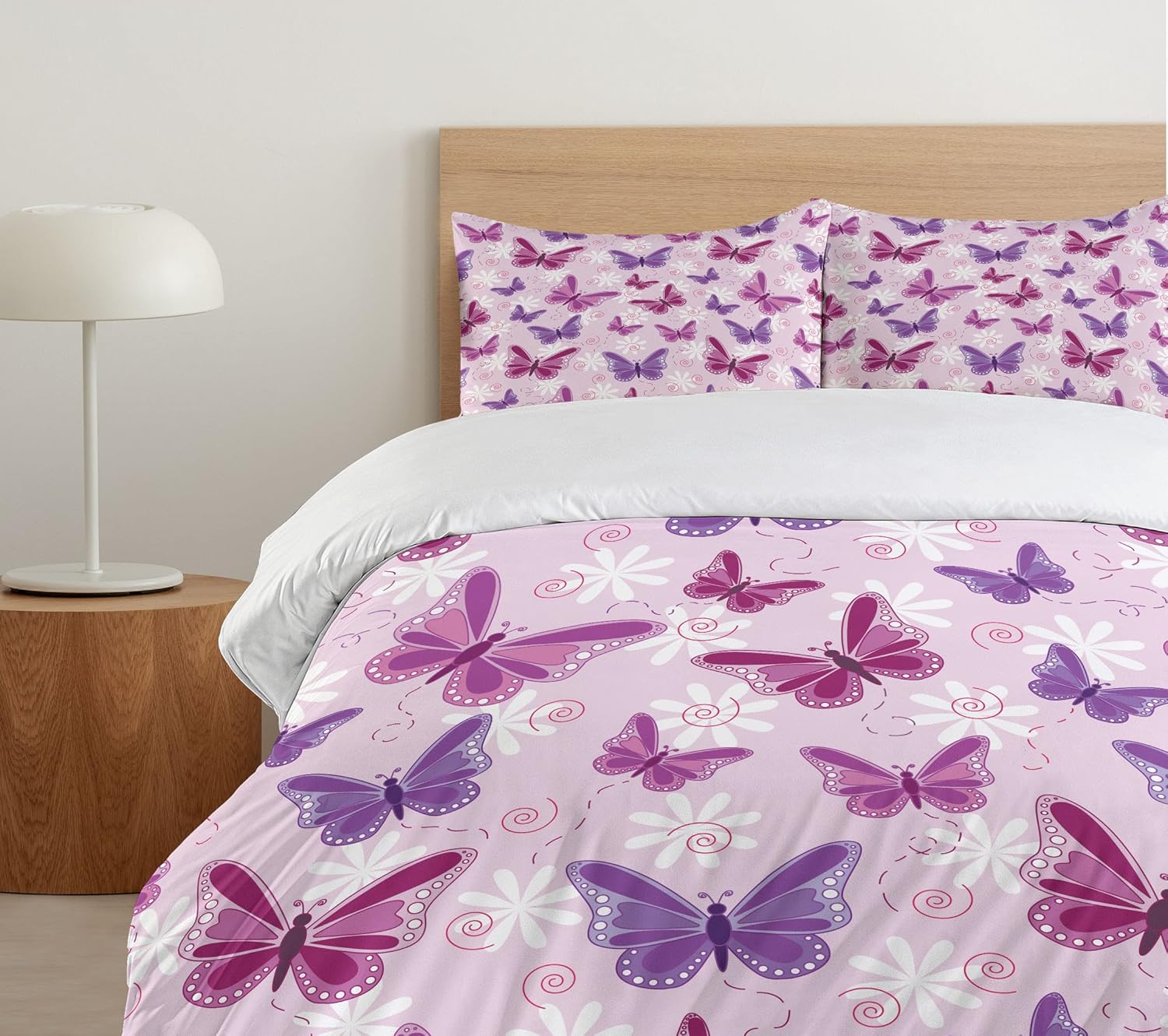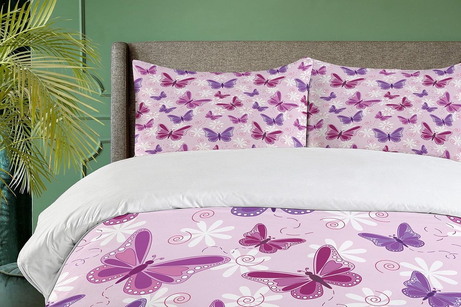 Ambesonne Butterfly Duvet Cover Set, Various Flying Butterflies Colors Hippie Style Print Design, Decorative 3 Piece Bedding Set with 2 Pillow Shams, Queen Size, Purple Magenta